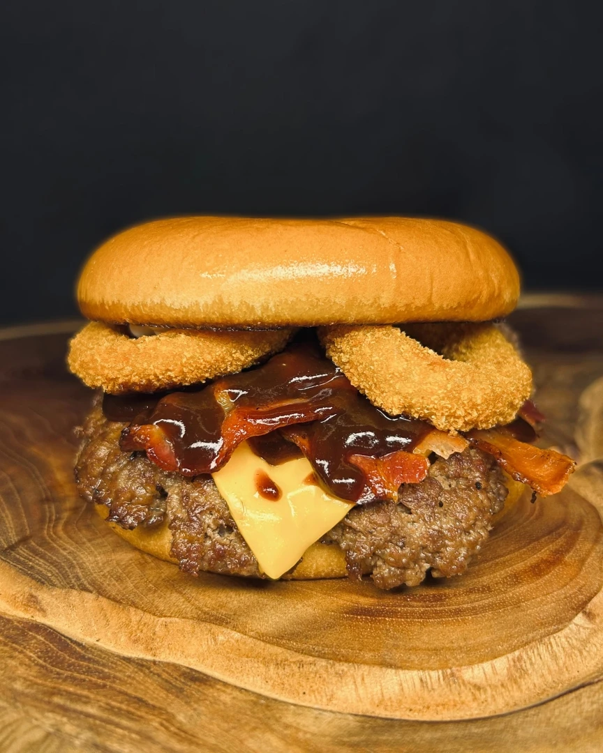 O Onion Burger! Delicioso burguer com pãozinho selado na ghee, 2 burgers de carne smasheados na chapa, 2 fatias do seu queijo favorito, tiras de bacon crocante, toque especial de barbecue, maionese defumada e anéis de cebola crocante pra fechar com chave de ouro!